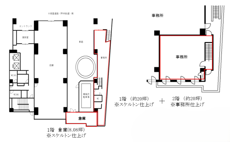 | 備考 | 事務所:1階+2階(40.46坪) 倉庫:1階(8.08坪) |